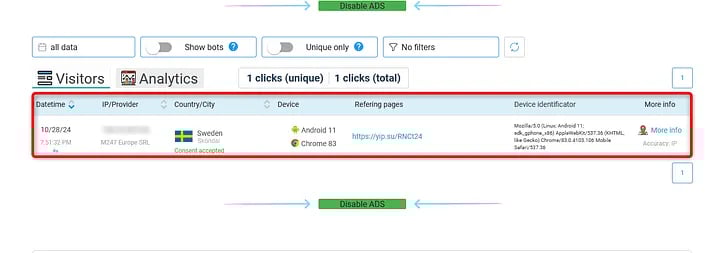 As you can see, we get the IP, device, and browser type in this case Chrome 8,3 and in the More Info,o we get the user location.