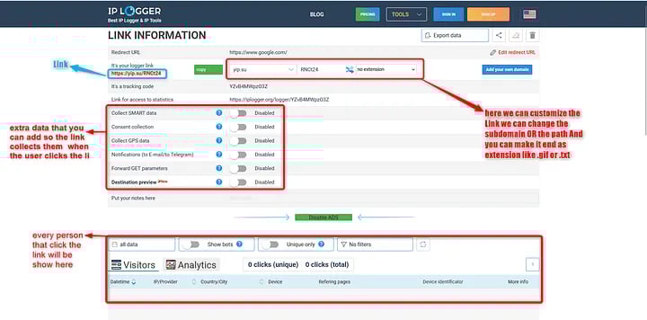 As you can see here, I want to get the user IP and data like location, browser, and operating system, so my link is just the Google site.
