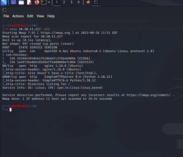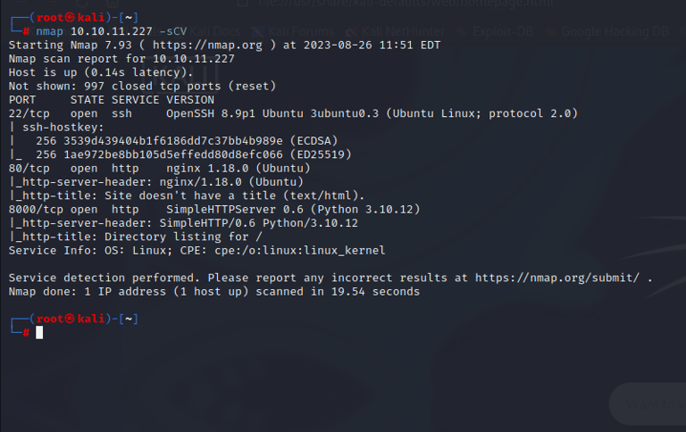 22/tcp open ssh & 80/tcp open http nginx 1.18.0 (Ubuntu) & 8000/tcp open http SimpleHTTPServer 0.6 (Python 3.10.12)