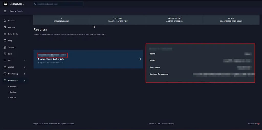 After I subscribed, I went back to the search engine typed an email, and searched for it, and pengo there I found breach data that included the username, the name, and email & Hashed Password.